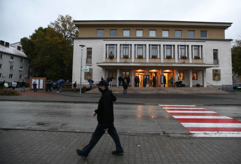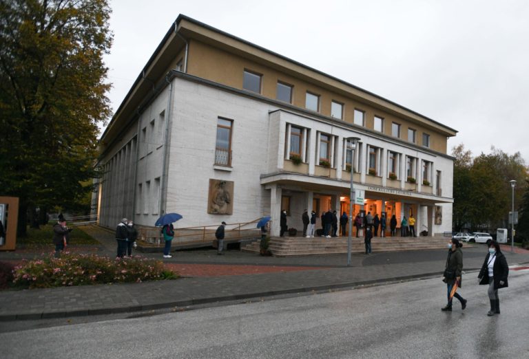 Obyvatelia v meste Stará Turá pred budovou Domu kultúry Javorina počas operácie Spoločná zodpovednosť, ktorá by mala zabezpečiť celoplošné testovanie obyvateľov Slovenska, antigénovým testom na COVID-19. Stará Turá, 31. október 2020. Foto: SITA/Martin Medňanský.