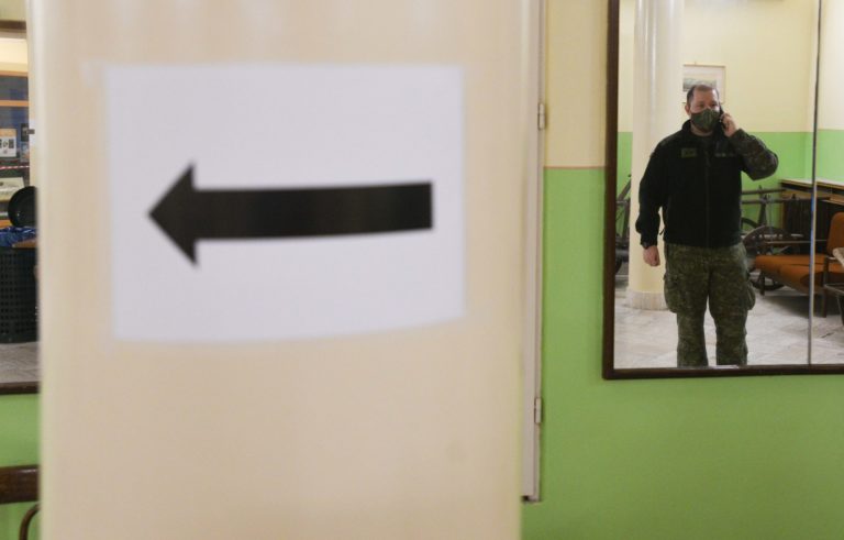 Príslušník Armády SR v Myjave v telocvični Základnej umeleckej školy v Starej Turej počas príprav na plošné testovanie obyvateľov Slovenska na COVID-19 v rámci operácie Spoločná zodpovednosť. Stará Turá, 30. október 2020. Foto: SITA/Martin Medňanský.