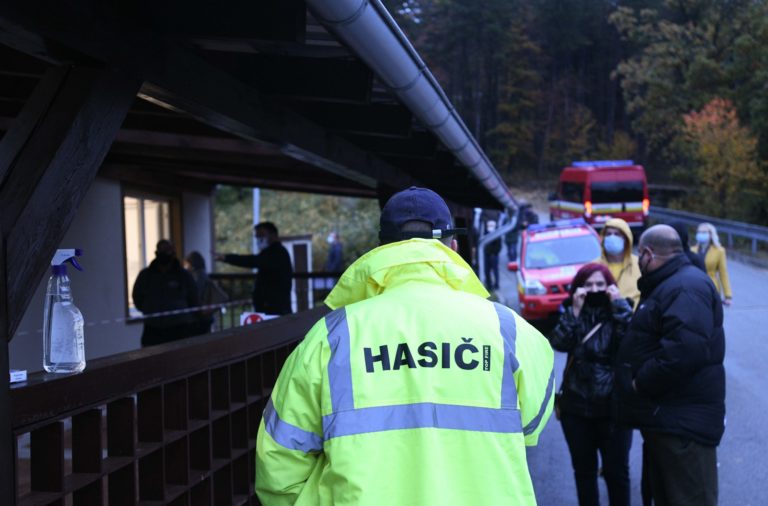 Odberné miesto vedľa hasičskej stanice dobrovoľných hasičov v časti Topolecká-Stará Turá počas príprav na plošné testovanie obyvateľov na Slovensku v rámci operácie Spoločná zodpovednosť. Stará Turá, 30. október 2020. Foto: SITA/Martin Medňanský.
