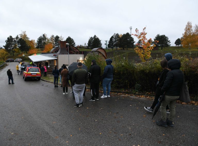 Atmosféra na odbernom mieste COVID-19 pri plavárni v Čadci počas druhého kola testovania v rámci operácie Spoločná zodpovednosť, ktorá by mala zabezpečiť celoplošné testovanie obyvateľov Slovenska, antigénovým testom na COVID-19. Čadca, 7. november 2020. Foto: SITA/Milo Fabian