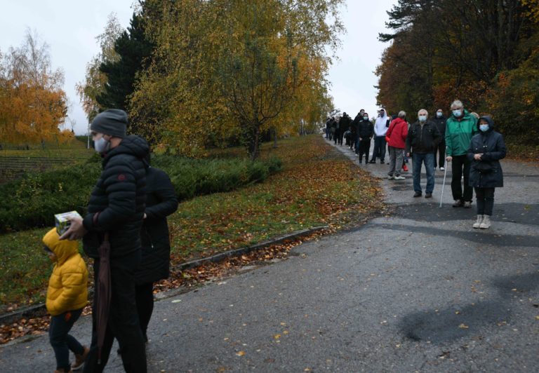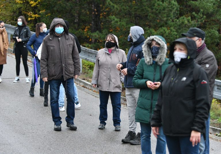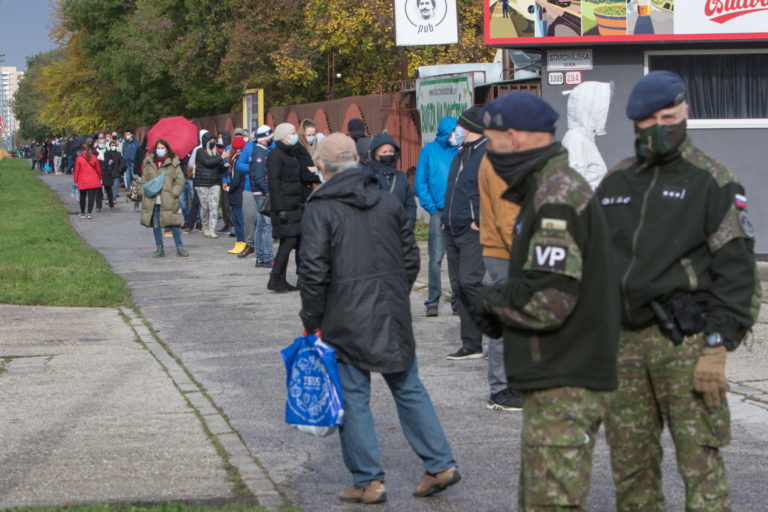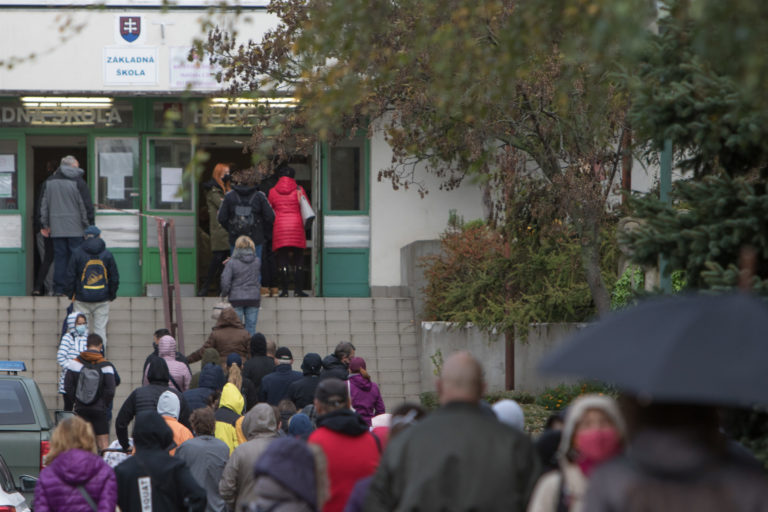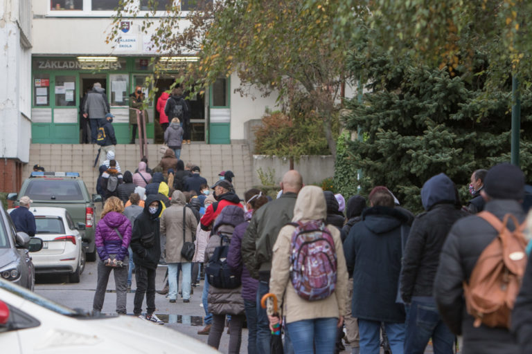Petržalčania čakajúci na testovanie COVID-19 na Základnej škole Holíčska počas operácie Spoločná zodpovednosť, ktorá by mala zabezpečiť celoplošné testovanie obyvateľov Slovenska antigénovým testom na COVID-19. Bratislava, 31. október 2020. Foto: SITA/Ľudovít Vaniher,