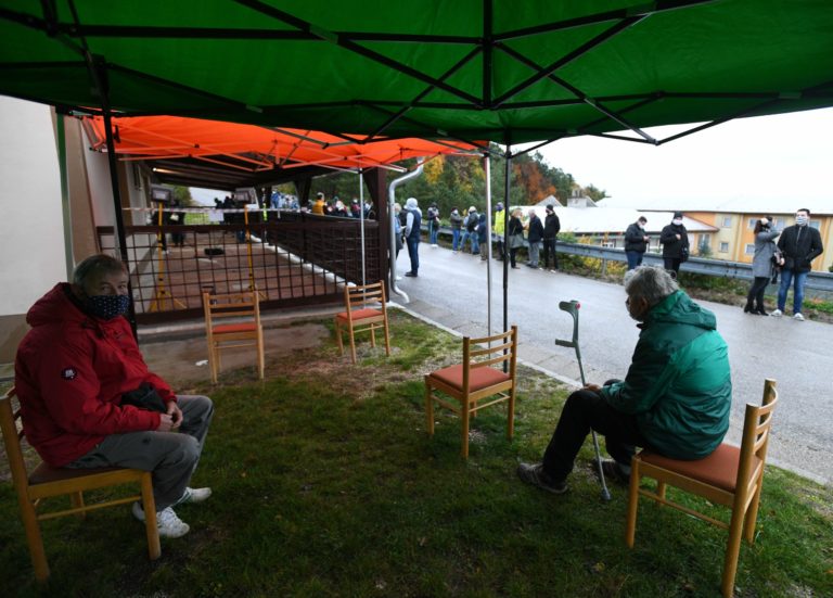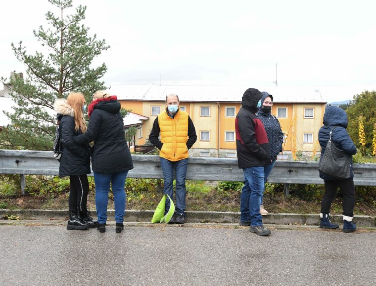 Obyvatelia v obci Lubina čakajú na certifikát počas operácie Spoločná zodpovednosť, ktorá by mala zabezpečiť celoplošné testovanie obyvateľov Slovenska, antigénovým testom na COVID-19. Lubina, okr. Nové Mesto nad Váhom, 31. október 2020. Foto: SITA/Martin Medňanský.
