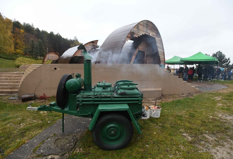 Pohľad na poľnú kuchyňu, kde sa pripravuje čaj v obci Lubina v amfiteátri Roh počas operácie Spoločná zodpovednosť, ktorá by mala zabezpečiť celoplošné testovanie obyvateľov Slovenska, antigénovým testom na COVID-19. Stará Turá, 31. október 2020. Foto: SITA/Martin Medňanský.