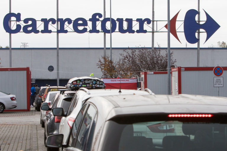 Kolóna vozidiel čakajúcich na drive-through testovanie COVID-19 pri bratislavskom OC DANUBIA počas operácie Spoločná zodpovednosť, ktorá by mala zabezpečiť celoplošné testovanie obyvateľov Slovenska, antigénovým testom na COVID-19. Bratislava, 31. október 2020. Foto: SITA/Ľudovít Vaniher,