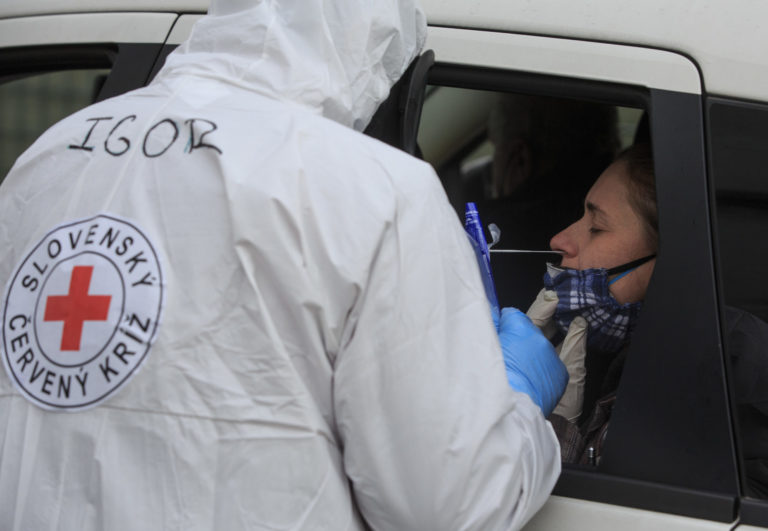 Zdravotník a žena v aute počas odberu na odbernom mieste COVID-19 pri ZOO v Mlynskej doline počas operácie Spoločná zodpovednosť, ktorá by mala zabezpečiť celoplošné testovanie obyvateľov Slovenska antigénovým testom na COVID-19. Bratislava, 31. október 2020. Foto: SITA/Branislav Bibel.