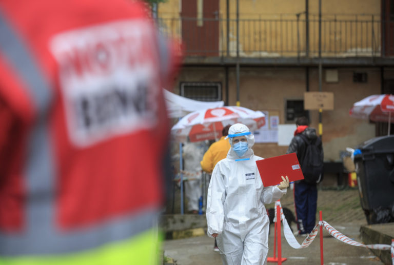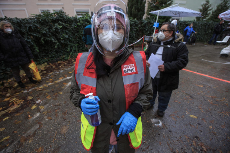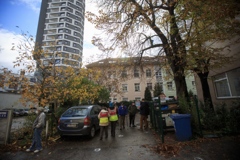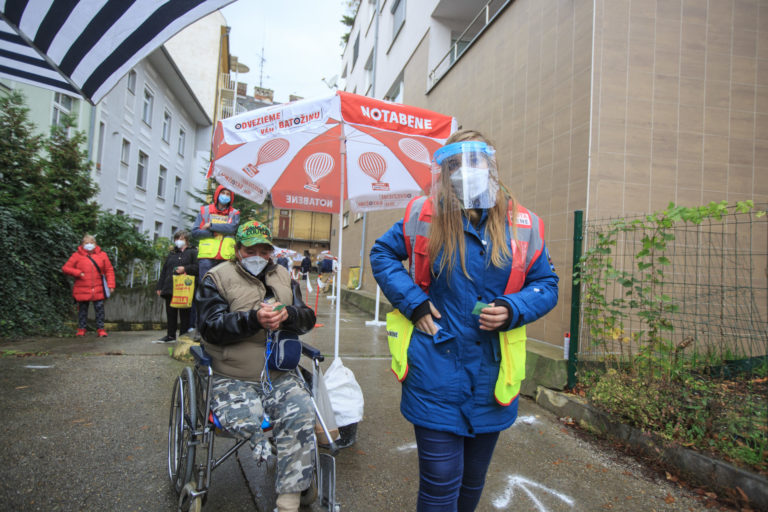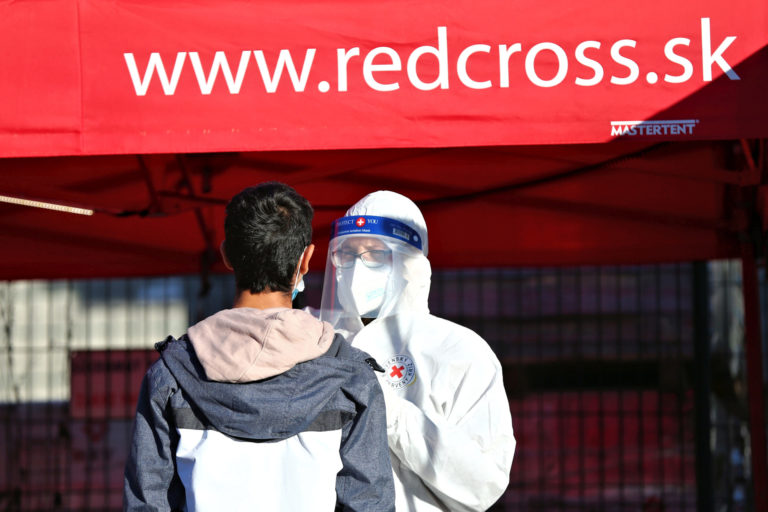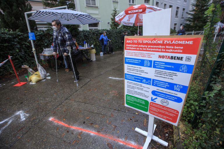 Odberné miesto COVID-19 Občianskeho združenia Proti prúdu na Karpatskej ulici zameraného na testovanie ľudí bez domova počas operácie Spoločná zodpovednosť, ktorá by mala zabezpečiť celoplošné testovanie obyvateľov Slovenska antigénovým testom na COVID-19. Bratislava, 31. október 2020. Foto: SITA/Branislav Bibel.