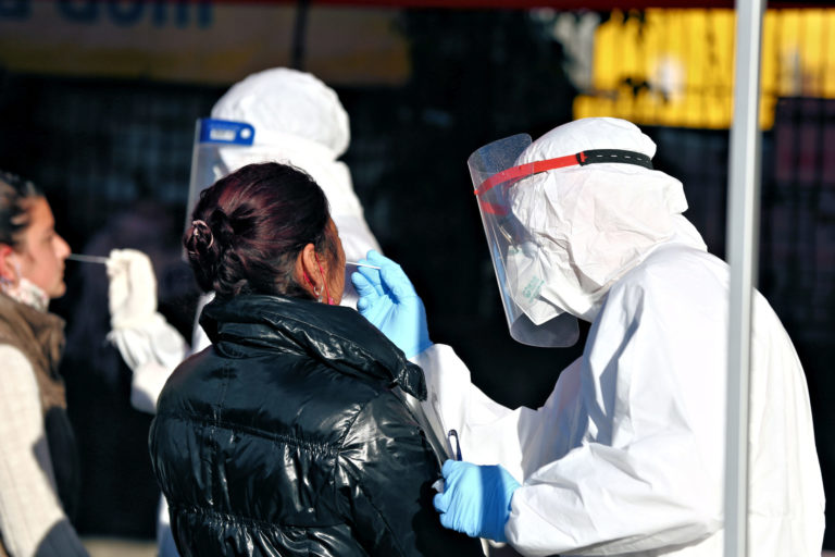 Zdravotníčka robí výter z nosohltana obyvateľovi obce v odbernom mieste COVID-19 v rómskej osade v obci Veľká Lomnica počas operácie Spoločná zodpovednosť, ktorá by mala zabezpečiť celoplošné testovanie obyvateľov Slovenska antigénovým testom na COVID-19. Veľká Lomnica, okr. Kežmarok, 31. október 2020. Foto: SITA/Oliver Ondráš.