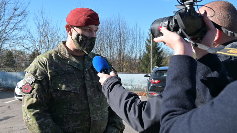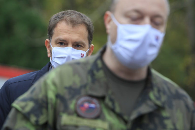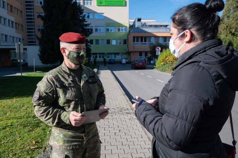 Veliteľ Síl pre špeciálne operácie OS SR plukovník Branislav Benka (vľavo) počas brífingu pred Kysuckou nemocnicou s poliklinikou v Čadci prei príležitosti druhého kola testovania v rámci operácie Spoločná zodpovednosť, ktorá by mala zabezpečiť plošné testovanie obyvateľov Slovenska, antigénovým testom na COVID-19. Čadca, 7. november 2020. Foto: SITA/Milo Fabian