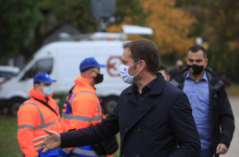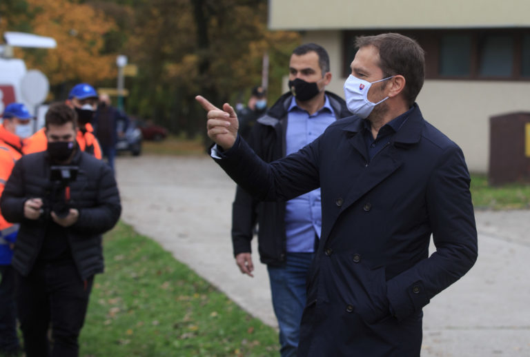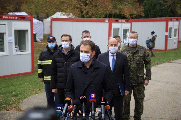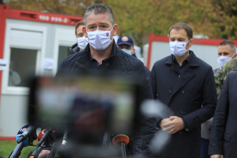 Minister vnútra Roman Mikulec a premiér Igor Matovič počas tlačovej konferencie vlády SR na tému: Zhodnotenie prvého dňa celoplošného testovania. Bratislava, 1. november 2020. Foto: SITA/Branislav Bibel.