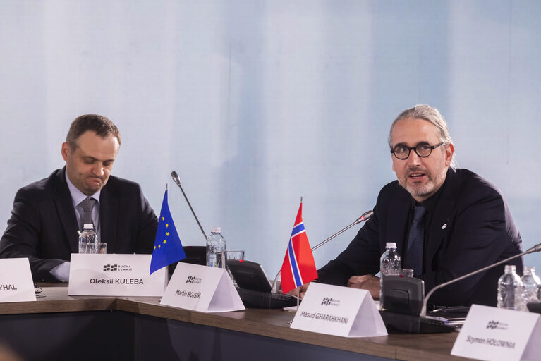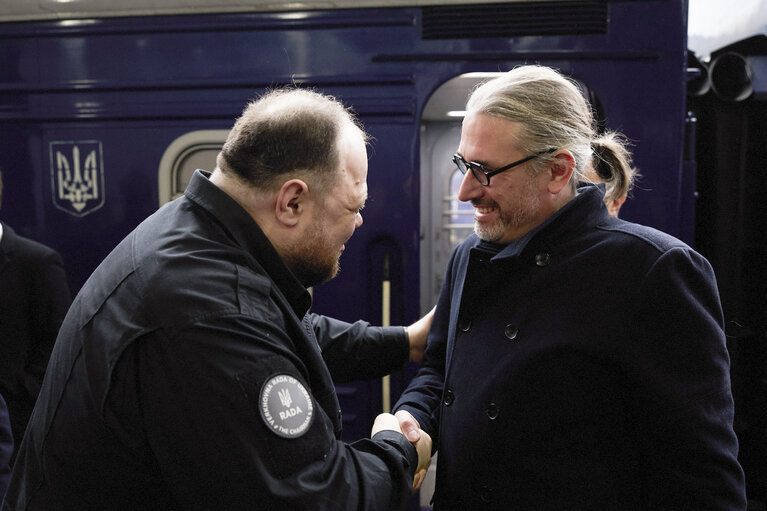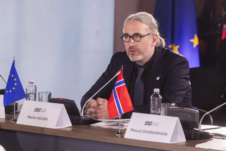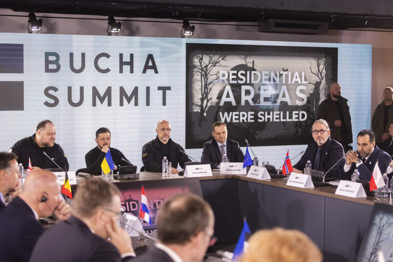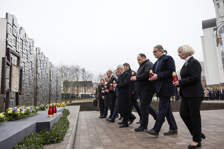Slovenský europoslanec Martin Hojsík (druhý sprava) počas návštevy Buče, kde si pripomenul 3. výročie oslobodenia mesta spod ruskej okupácie a zúčastnil sa na tiež na samite v tomto ukrajinskom meste, v Buči 31. marca 2025. Foto: Európsky parlament