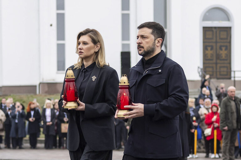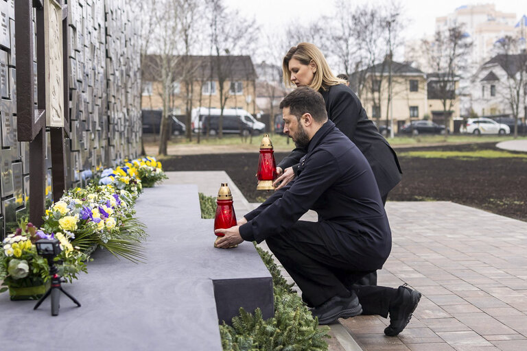 Ukrajinský prezident Volodymyr Zelenskyj s manželkou Olenou si pripomenuli obete ruskej okupácie mesta Buča pri Kyjeve, 31. marca 2025. Foto: Európsky parlament