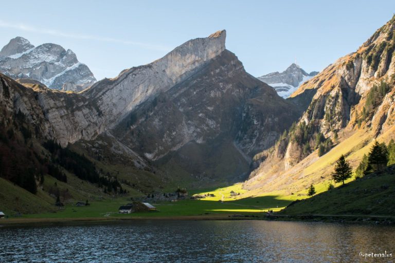 Ranné dotyky slnka s dedinkou pri Seealpsee v Alpách