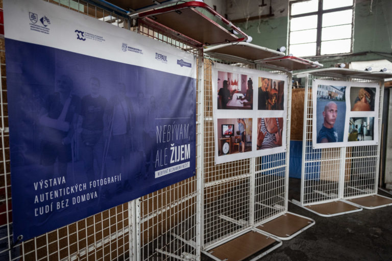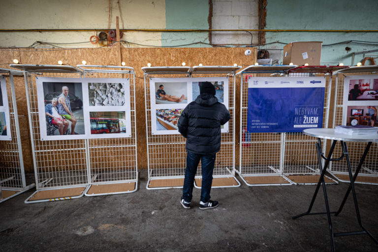 Výstava fotografií ľudí bez domova počas charitatívneho podujatia Doma dobre v priestoroch Nocľahárne sv. Vincenta de Paul v Bratislave. Bratislava, 10. december 2023. Foto: SITA/Jana Birošová