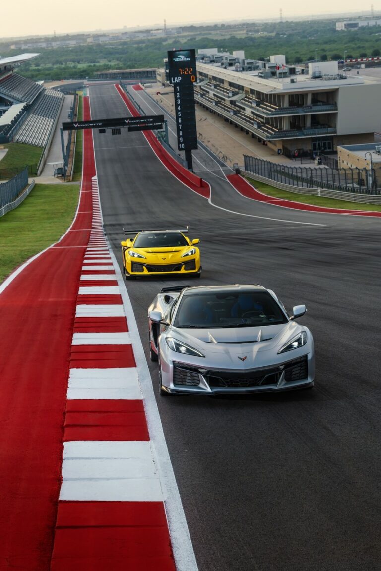 Pohľad spredu na Corvette ZR1X v striebornej metalíze Blade Silver a ZR1 s balíkom ZTK Performance Package v žltej metalíze Competition Yellow Tintcoat jazdiace na pretekárskej trati. S modelmi ZR1 a ZR1X má teraz Chevrolet najvýkonnejšie duo amerických výkonných vozidiel spomedzi všetkých výrobcov automobilov. Foto: Chevrolet