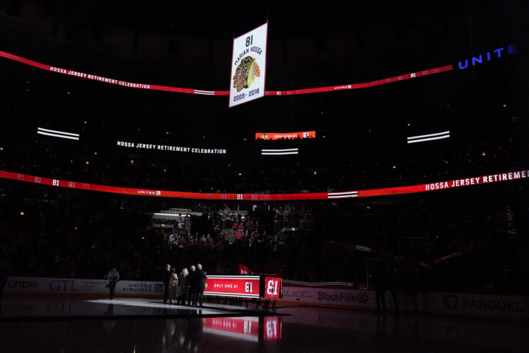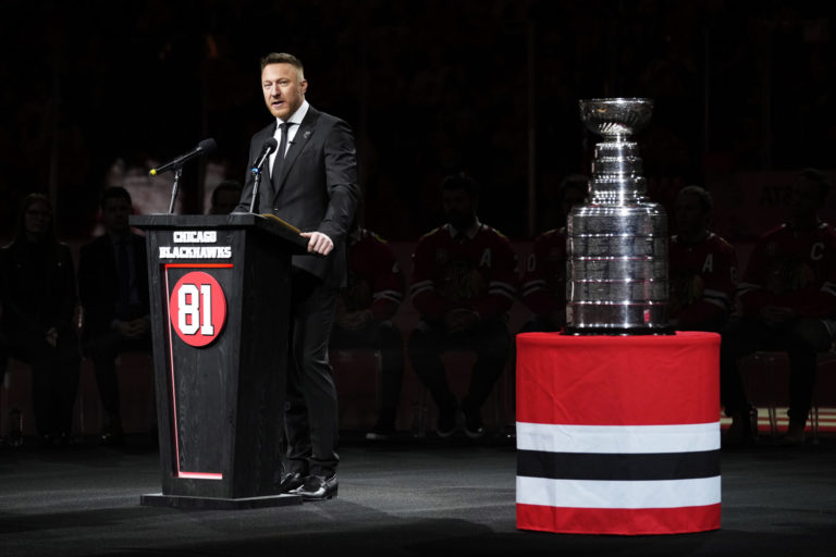 Marián Hossa počas ceremoniálu vyradenie jeho dresu tímom Chicago Blackhawks, ktorý putoval pod stredu štadióna United Center. Chicago, 20. november 2022. Foto: SITA/AP.