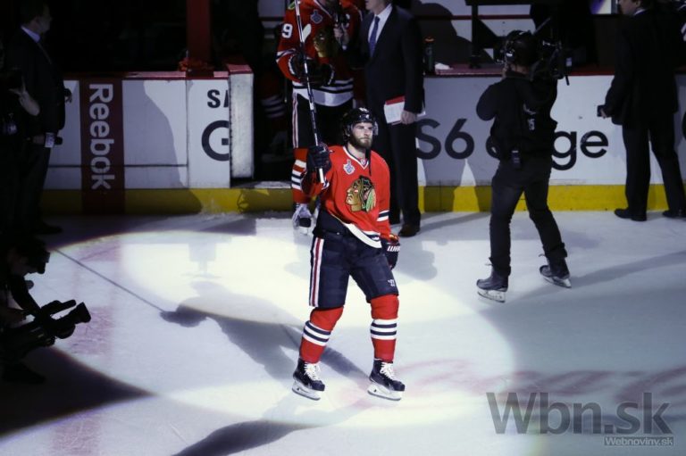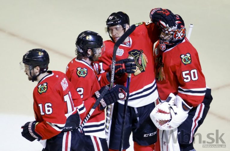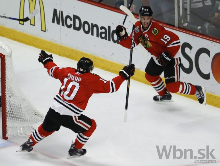 Hokejista Chicaga Jonathan Toews (vľavo) skóruje počas druhej tretiny štvrtého finálového zápasu o Stanleyho pohár. Foto: SITA/AP