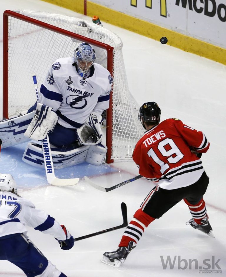 Hráč Chicaga Jonathan Toews (vpravo) strieľa gól do brány Tampy počas druhej tretiny štvrtého finálového zápasu o Stanleyho pohár. Foto: SITA/AP