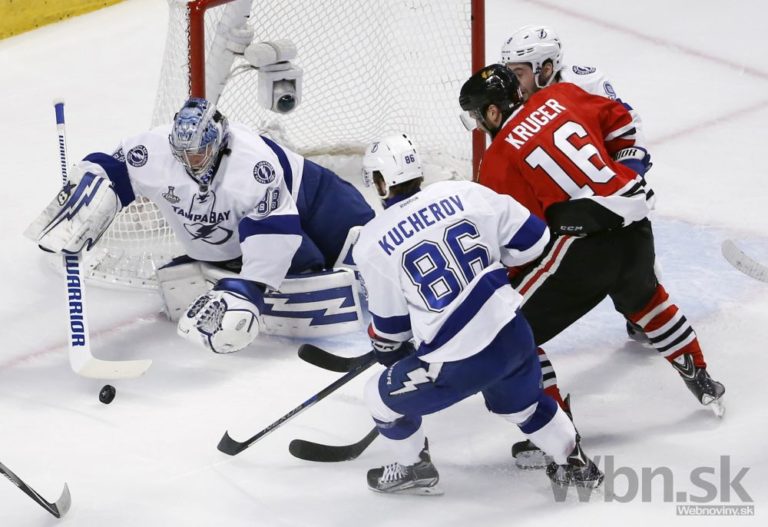 Gólman Tampa Bay Andrej Vasilevskij sa pozerá na puk, ktorý mieri k hráčovi Chicaga Marcusovi Krugerovi počas druhej tretiny štvrtého finálového zápasu o Stanleyho pohár. Foto: SITA/AP