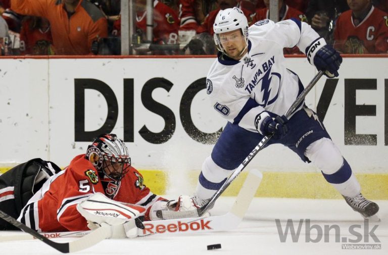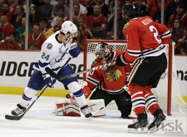 Brankár Chicaga Corey Crawford (vľavo) odráža puk hráča Tampy Antona Stralmana (vpravo) počas prvej tretiny štvrtého finálového zápasu o Stanleyho pohár. Foto: SITA/AP