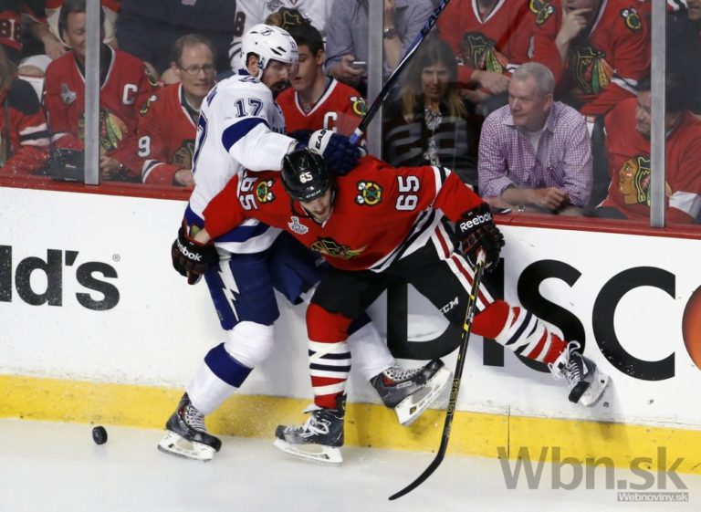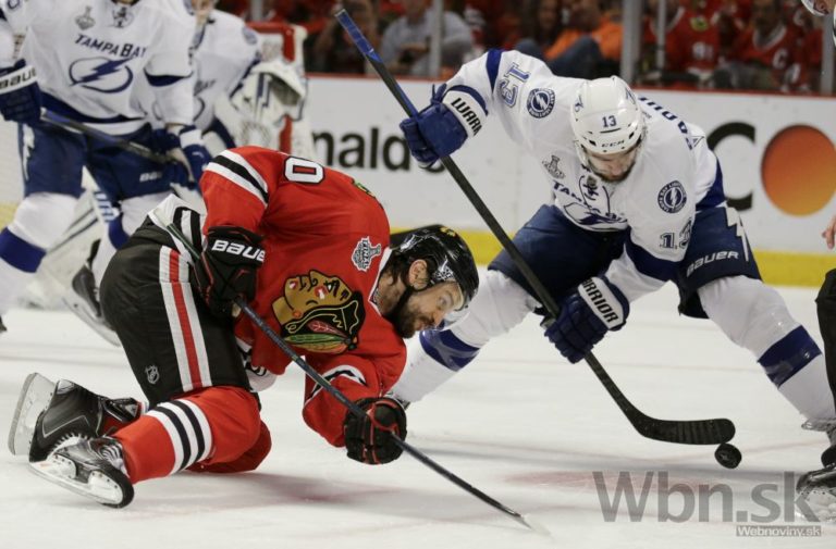 Hráč Chicaga Jonathan Toews (vpravo) sa snažil dostať puk do brány Tampy počas druhej tretiny finálového zápasu o Stanleyho pohár. Foto: SITA/AP