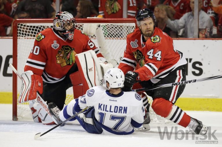 Hráč Tampy Alex Killorn (uprostred) spadol pred bránkou Coreyho Crawforda (vľavo) počas prvej tretiny finálového zápasu o Stanleyho pohár. Foto: SITA/AP