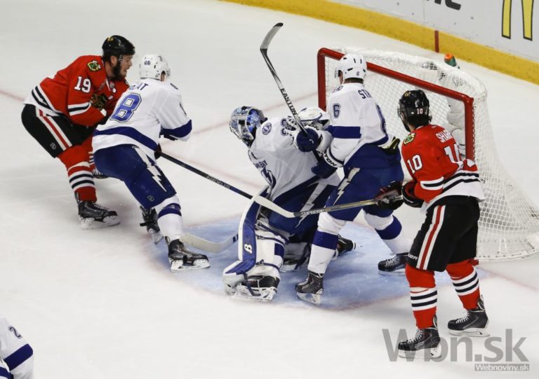 Hokejista Chicaga Jonathan Toews (vpravo) spadol pri bránke gólmana Tampy počas druhej tretiny štvrtého finálového zápasu o Stanleyho pohár. Foto: SITA/AP