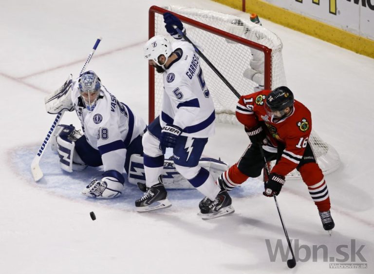 Gólman Tampy Andrej Vasilevskij (vľavo) chytá puk hráča Chicaga Marcusa Krugera (vpravo) počas prvej tretiny finálového zápasu o Stanleyho pohár. Foto: SITA/AP