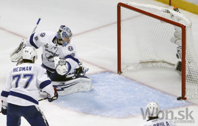 Hokejisti Tampy sa spolu s gólmanom Andrejom Vasilevskim pozerajú, či sa puk dostal do bránky počas druhej tretiny štvrtého finálového zápasu o Stanleyho pohár. Foto: SITA/AP