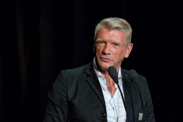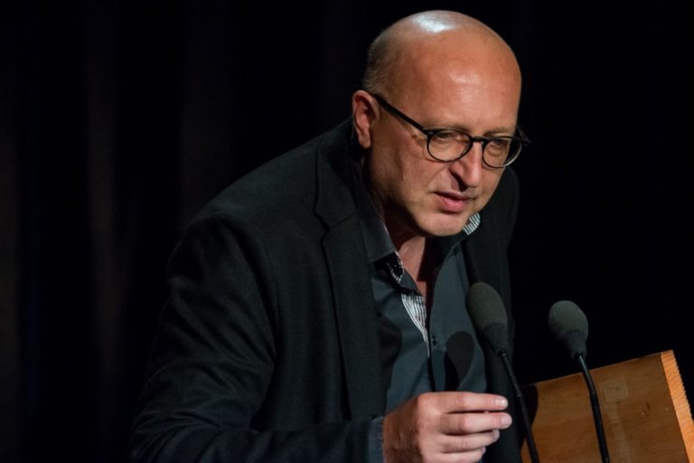 Riaditeľ Činohry SND Roman Polák (vľavo) počas 21. ročníka divadelných ocenení sezóny DOSKY 2016. Bratislava, 18. september 2016. Foto: SITA/Marek Mrviš