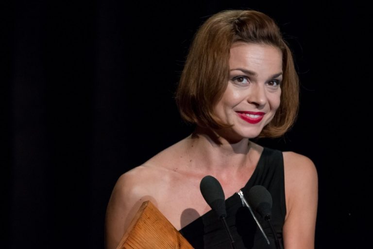 Herečka Petra Vajdová si preberá ocenenie v kategórii Najlepší ženský herecký výkon sezóny 2015/2016 za postavu Emílie Ekdahlovej v inscenácii Fanny a Alexander počas 21. ročníka divadelných ocenení sezóny DOSKY 2016 v Slovenskom národnom divadle (SND). Bratislava, 18. september 2016. Foto: SITA/Marek Mrviš