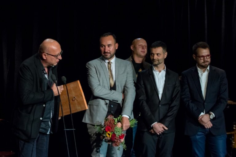 Herec Tomáš Turek si preberá ocenenie v kategórii Objav sezóny 2015/2016 za postavu Christophera v inscenácii hry Podivný prípad so psom počas 21. ročníka divadelných ocenení sezóny DOSKY 2016. Bratislava, 18. september 2016. Foto: SITA/Marek Mrviš