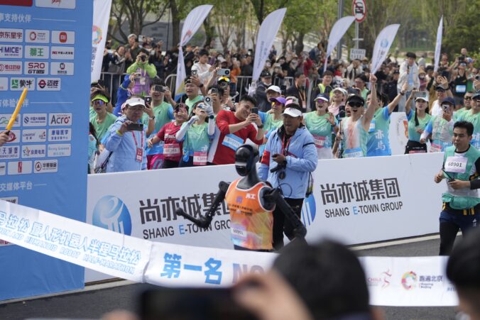 Robot Sky Project Ultra prechádza cieľovou čiarou a vyhráva polmaratón humanoidných robotov, ktorý sa konal v Pekingu v sobotu 19. apríla 2025. Foto: SITA/AP Photo/Ng Han Guan