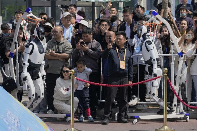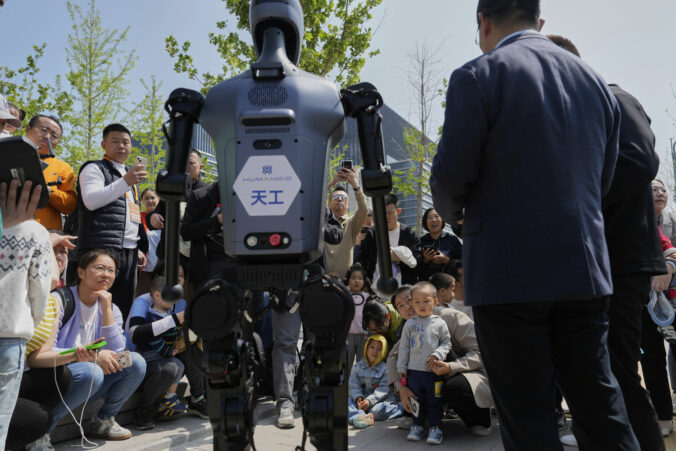 Diváci sa pozerajú na robota po polmaratóne, ktorý sa konal v Pekingu v sobotu 19. apríla 2025. Foto: SITA/AP Photo/Ng Han Guan
