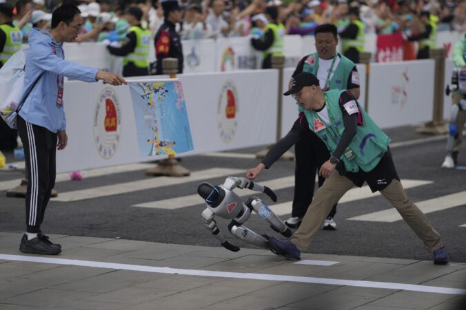 Robot stráca kontrolu na štarte prvého robotického polmaratónu na svete. Foto: SITA/AP Photo/Ng Han Guan
