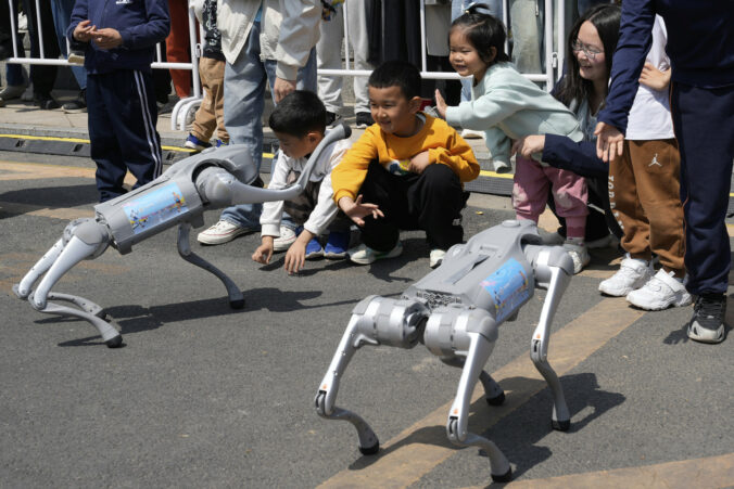 Deti spolu so štvornohými robotmi pred slávnostným odovzdávaním cien na polmaratóne. Foto: SITA/AP Photo/Ng Han Guan