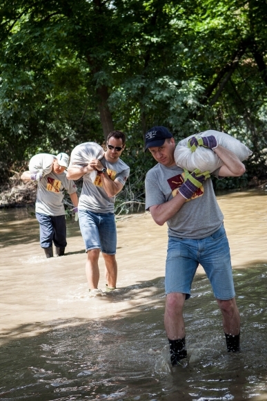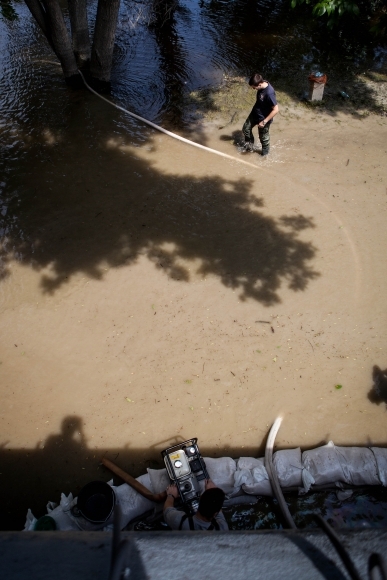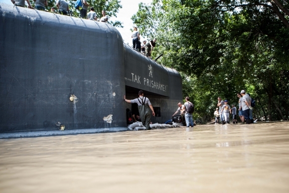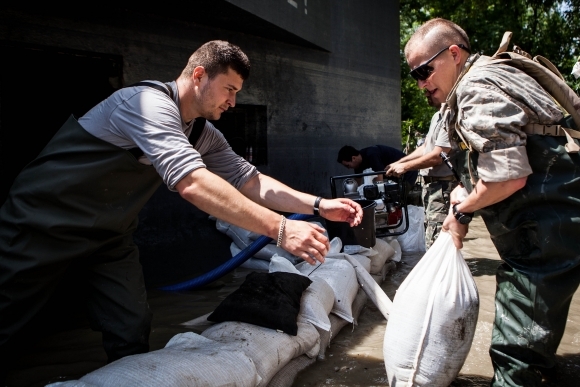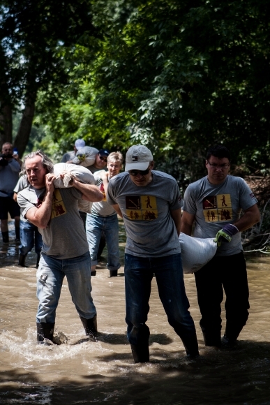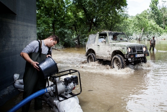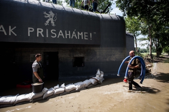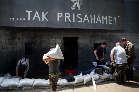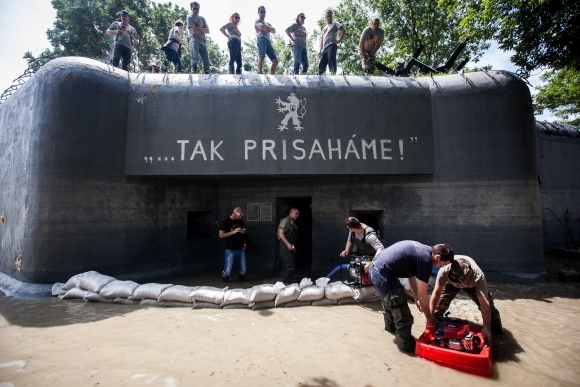 Dobrovoľníci a top manažéri slovenských a zahraničných firiem čistia a odčerpávajú vodu zo zatopeného bunkra B-S.4 v Pečnianskom lese. Bunker bol počas povodní zatopený asi do dvoch tretín. Bratislava, 14. jún 2013. Foto: SITA/Jozef Jakubčo