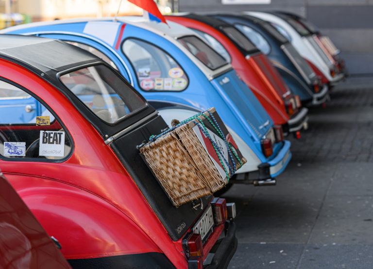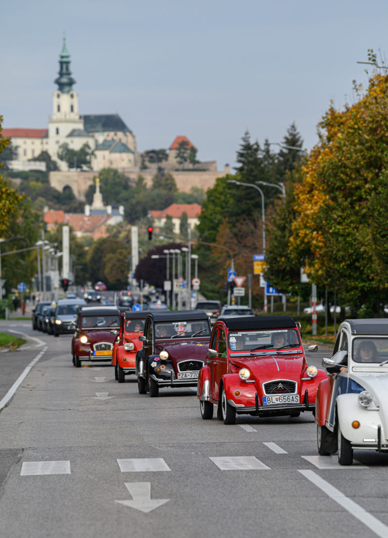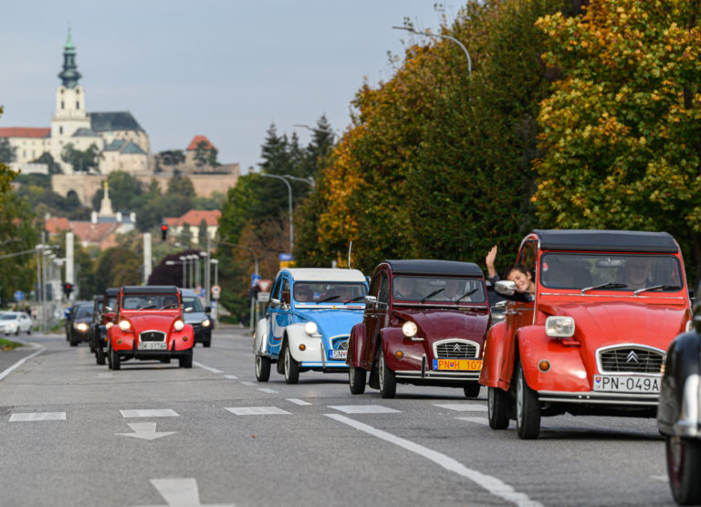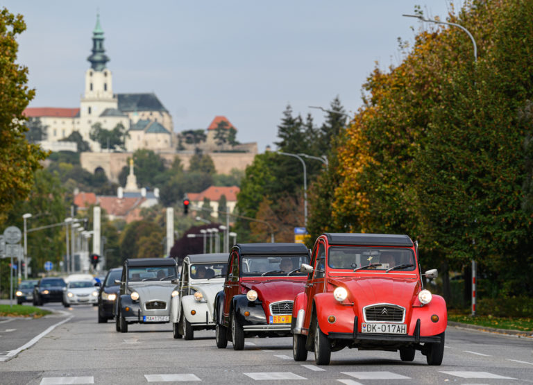 Citroën "kačice", ktoré predstavil Citroën 2CV club Slovakia, sa presúvajú spred obchodného centra Mlyny na výstavu Autosalón Autoshow 2022 v Nitre. Nitra, 16. október 2022. Foto: SITA/Martin Havran.