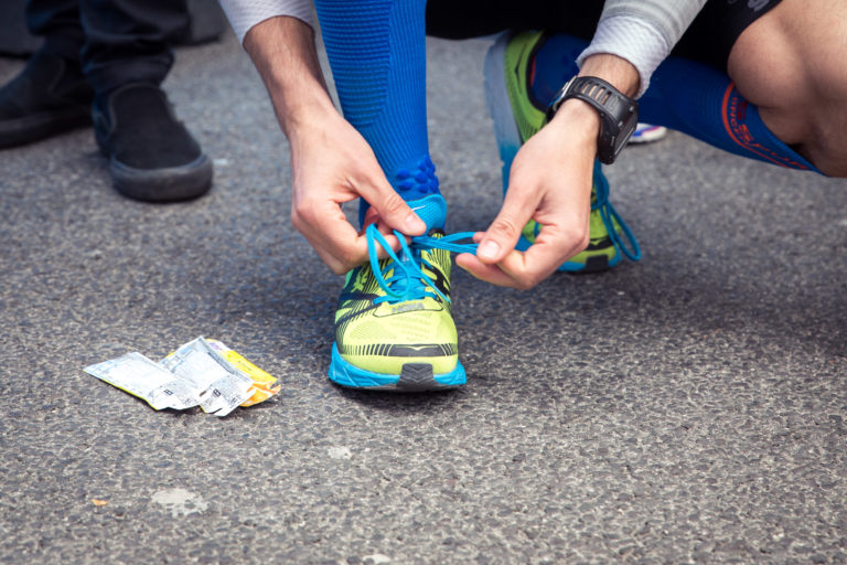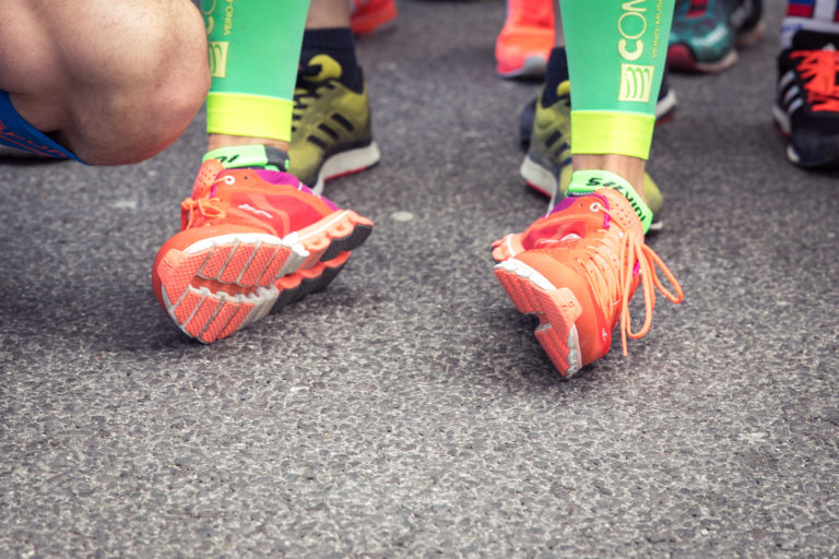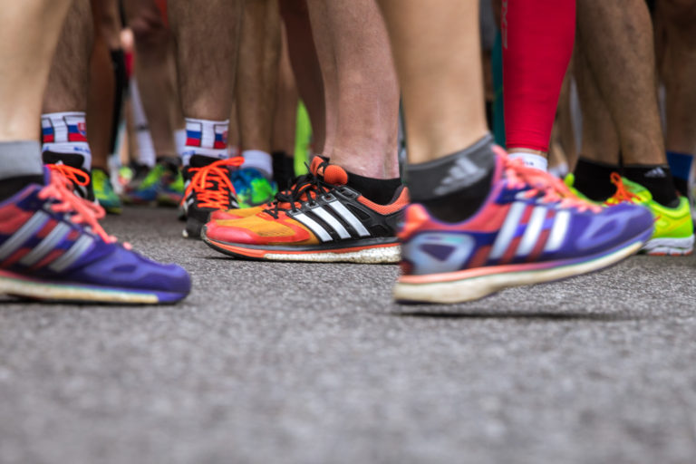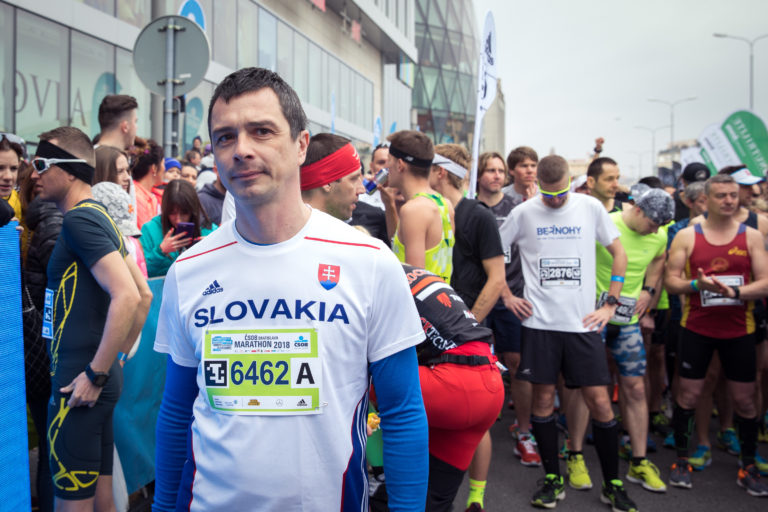 Prezident Slovenského ateltického zväzu (SAZ) Peter Korčok (vľavo) počas štartu 13. ročníka bratislavského mestského maratónu - ČSOB Bratislava Marathon 2018. Bratislava, 8. apríl 2018. Foto: SITA/Diana Černáková.