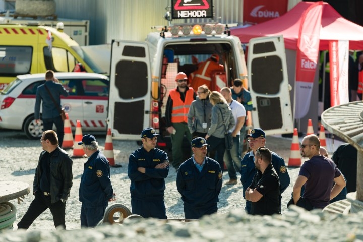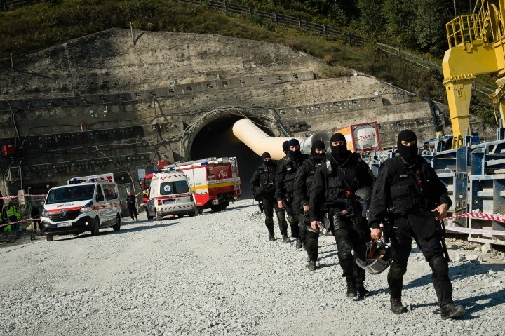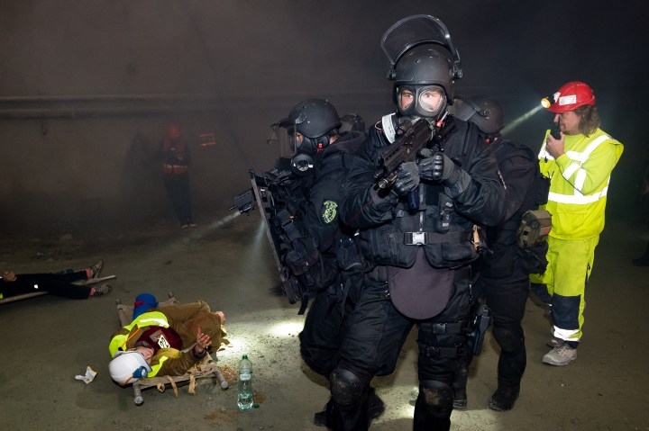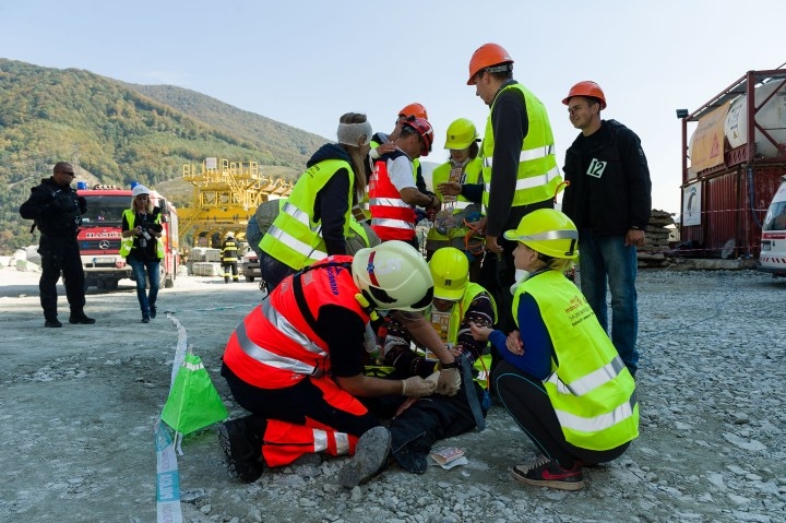 Cvičenie záchranných zložiek pri likvidácii následkov udalosti s hromadným postihnutím osôb na stavbe pri východnom portáli diaľničného tunela Višňové na úseku diaľnice D1 v oblasti Dubná Skala. Vrútky, 30. september 2016. Foto: SITA/Milo Fabian