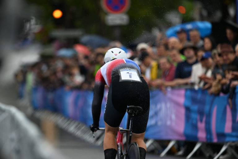 Francúzska cyklistka Audrey Cordon-Ragot počas individuálnej časovky žien v rámci XXXIII. letných olympijských hier 2024 v Paríži. Paríž, 27. júl 2024. Foto: SITA/Martin Medňanský