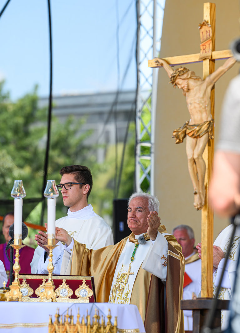 Prezident SR Peter Pellegrini (uprostred) počas slávnostnej svätej omše pri príležitosti Národnej púte k sv. Cyrilovi a Metodovi. Nitra 5. júl 2024. Foto: SITA/Martin Havran.