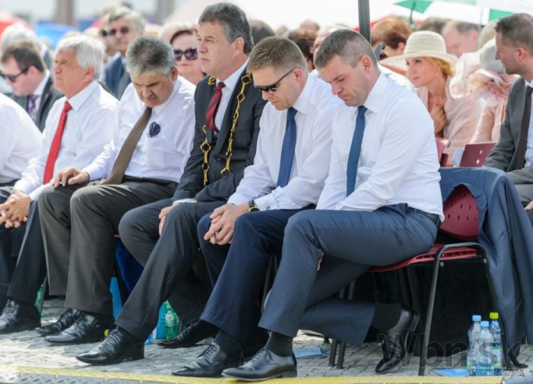 Sprava: Predseda NR SR Peter Pellegríni, premiér Robert Fico a minister práce sociálnych vecí a rodiny SR Ján Richter počas Cyrilo-metodskej národnej púte v Nitre. Cyrilo-metodská národná púť je vyvrcholením duchovného programu každoročných Cyrilo-metodských slávností v Nitre. Nitra, 5. júl 2015. Foto: SITA/Martin Havran