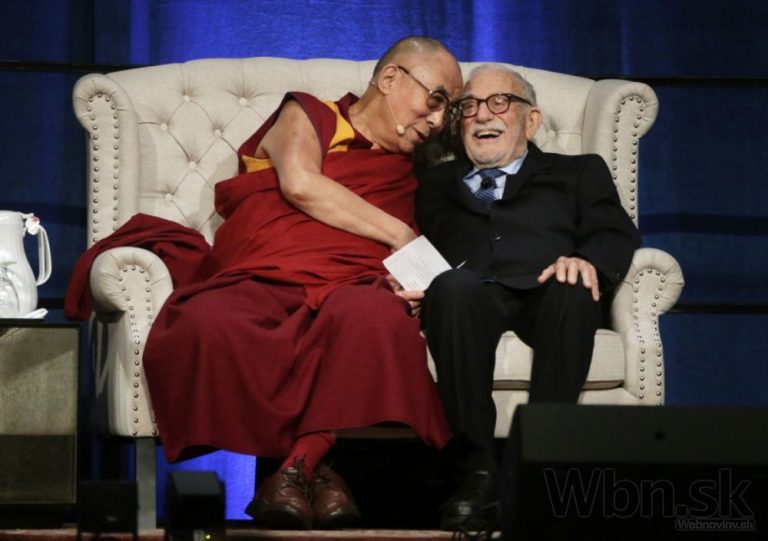 Tibetský duchovný vodca dalajláma oslávil svoje 80. narodeniny na pôde USA, kde sa v súčasnosti nachádza na trojdňovom summite o súcite. Na fotografii: S oceánografom Walterom Munkom. Kalifornia, 7. júla 2015. Foto: SITA/AP