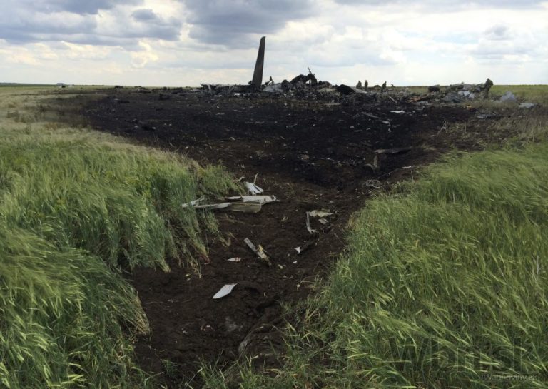 Proruskí povstalci zostrelili nad letiskom v nepokojnom meste Luhansk ukrajinské nákladné lietadlo s označením Iljušin Il-76. Pri útoku zomreli 49 ukrajinských vojakov. Foto: SITA/AP