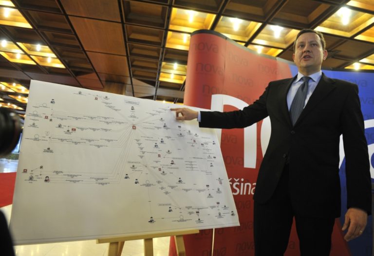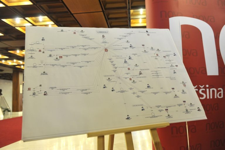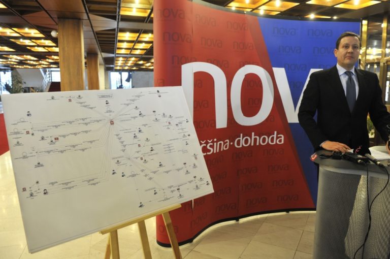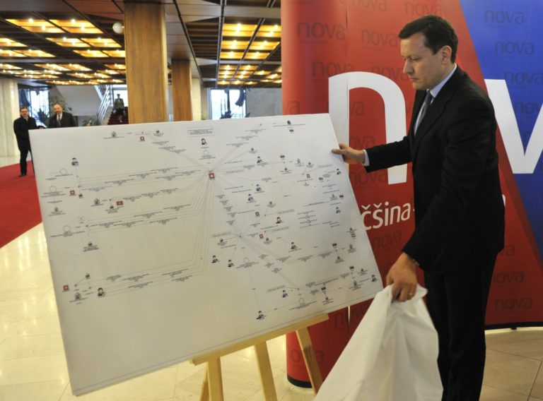 Organigram poslanca a predsedu hnutia NOVA Daniela Lipšica vypracovala podľa jeho slov švajčiarska polícia. Odhalili ho počas brífingu hnutia NOVA na tému: Strhnutie plachty z emisného zoznamu. Bratislava, 4. február 2014. Foto: SITA/Ján Slovák