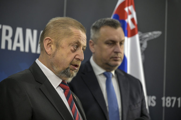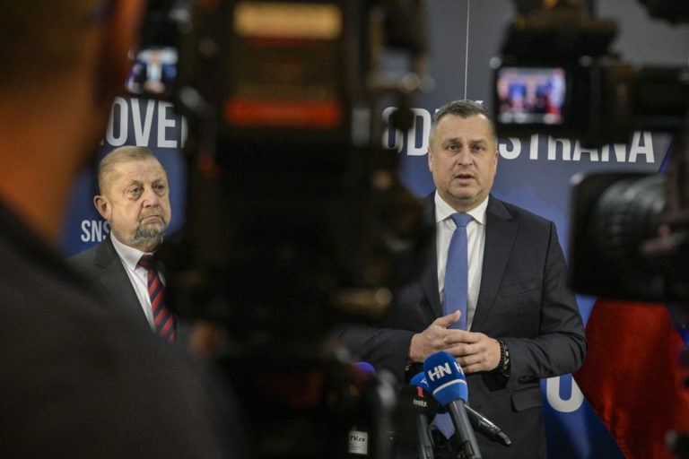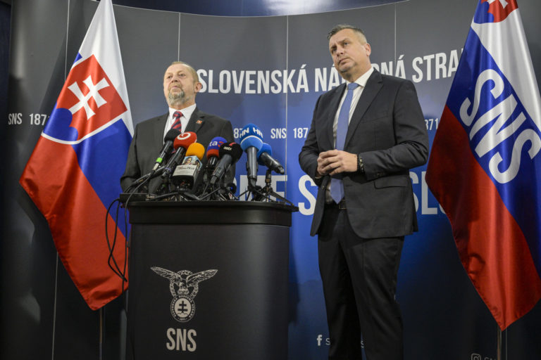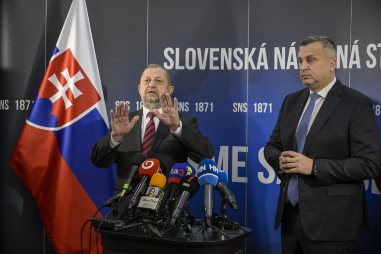Zľava: Občiansky kandidát na prezidenta SR Štefan Harabin a kandidát na prezidenta SR za stranu SNS Andrej Danko počas tlačovej konferencie kandidátov na prezidenta Andreja Danka a Štefana Harabina v sídle Slovenskej národnej strany (SNS), v rámci ktorej sa Andrej Danko vzdal prezidentskej kandidatúry a podporil vo voľbách na prezidenta SR Štefana Harabina. Bratislava, 18. marec 2024. Foto: SITA/Milan Illík.