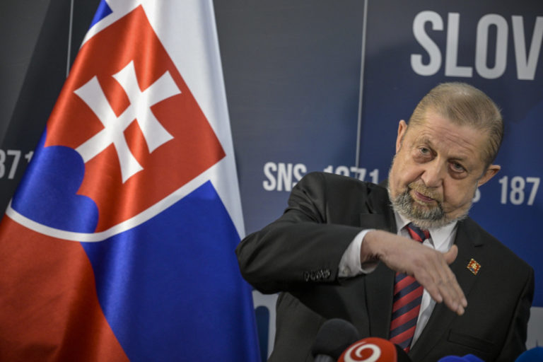 Občiansky kandidát na prezidenta SR Štefan Harabin počas tlačovej konferencie kandidátov na prezidenta Andreja Danka a Štefana Harabina v sídle Slovenskej národnej strany, v rámci ktorej sa Andrej Danko vzdal prezidentskej kandidatúry a podporil vo voľbách na prezidenta SR Štefana Harabina. Bratislava, 18. marec 2024. Foto: SITA/Milan Illík.