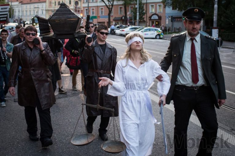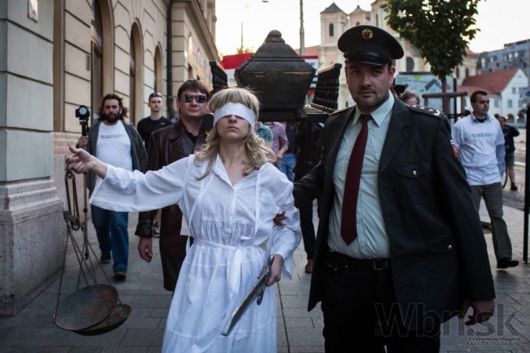 Vyvrcholením demonštrácie za podporu Hedvigy bolo krátke predstavenie, ktoré symbolizovalo zabitie slovenskej justície. Foto: SITA/Jozef Jakubčo