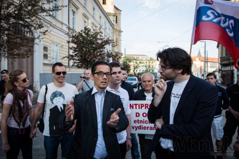 Prvý podpredseda SNS Rafael Rafaj (vľavo v popredí) počas demonštrácie na podporu Hedvigy Malinovej Žákovej, s názvom Dnes Hedviga, zajtra Ty? Spravodlivosť pre všetkých!, pred budovou Ministerstva spravodlivosti SR. Foto: SITA/Jozef Jakubčo