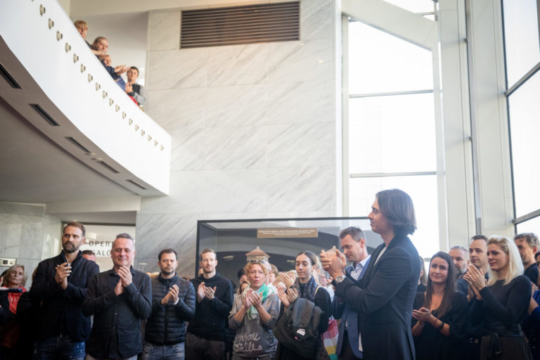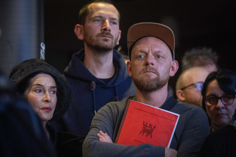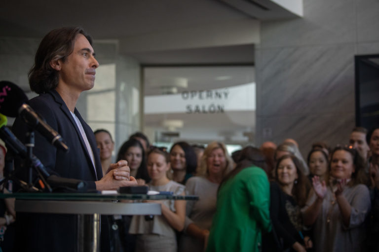 Odchádzajúci generálny riaditeľ Slovenského národného divadla (SND) Matej Drlička (vpravo v popredí) počas brífingu k jeho prijatiu demisie. Ministerka kultúry SR Natália Milanová odvolala Drličku z funkcie k 1. novembru 2022 z dôvodu jeho výrokov na umelcov a politikov. Bratislava, 25. október 2022. Foto: SITA/Diana Černáková